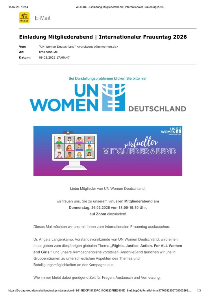 Die Einladungen von UN Women Deutschland zu Mitgliederversammlungen sowie der Austausch mit den anderen Mitgliedern fokussiert die Arbeit des Bahá’í-Frauen-Forum e. V. auf weltweit relevantes gesellschaftliches Wirken und ist für uns von daher stets ein wichtiges Datum im Kalender. Denn die aus diesem Austausch resultierenden Positionen und Statements fließen letztendlich jeweils in die Vorbereitung der CEDAW (FRK Frauenrechtskommission) ein. In diesem Jahr lautet das Motto von UN Women zum Internationalen Frauentag am 08.03.2026 „Rights. Justice. Action. For ALL Women and Girls“. Ein Motto, das auch jede Ortsgruppe aufgreifen kann, um sich zum Weltfrauentag zu positionieren.